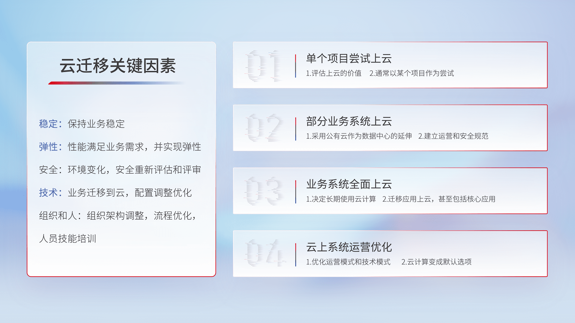 结合实际业务,,,,从规划设计、、、云平台选型、、、、云原生改造、、、、数据迁移、、、、集成交付,,,,迁移全过程为客户识别最佳上云路径,,做好风险识别管理,,,,设计网络架构、、身份权限、、安全审计合规、、、操作审计、、日志审计、、、、监控告警策略、、多站点容灾设计等,,,,对云上基础设施进行整体规划,,提升IT治理水平,,,,以满足弹性、、、高可用、、、、高性能的需求。。。。