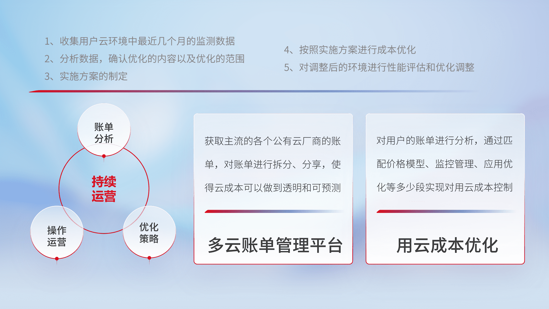 通过多云纳管,,,以统一的资源数据模型把客户的云资源进行抽象和封装,,,进而实现对多云资源的统一操作,,,保障云资源管理的可靠性、、稳定性与可用性。。。量身定制化运维内容,,,,配置、、开发运维、、、补丁管理、、、备份、、监控、、认证和访问管理、、、审计和日常巡检等,,,保障在用云过程中的可靠度,,,,稳定度以及高可用率。。。。